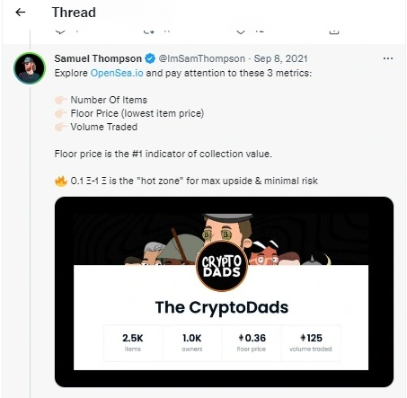 Here’s a screenshot of a Twitter thread from Samuel Thompson on how to choose which NFT to trade: